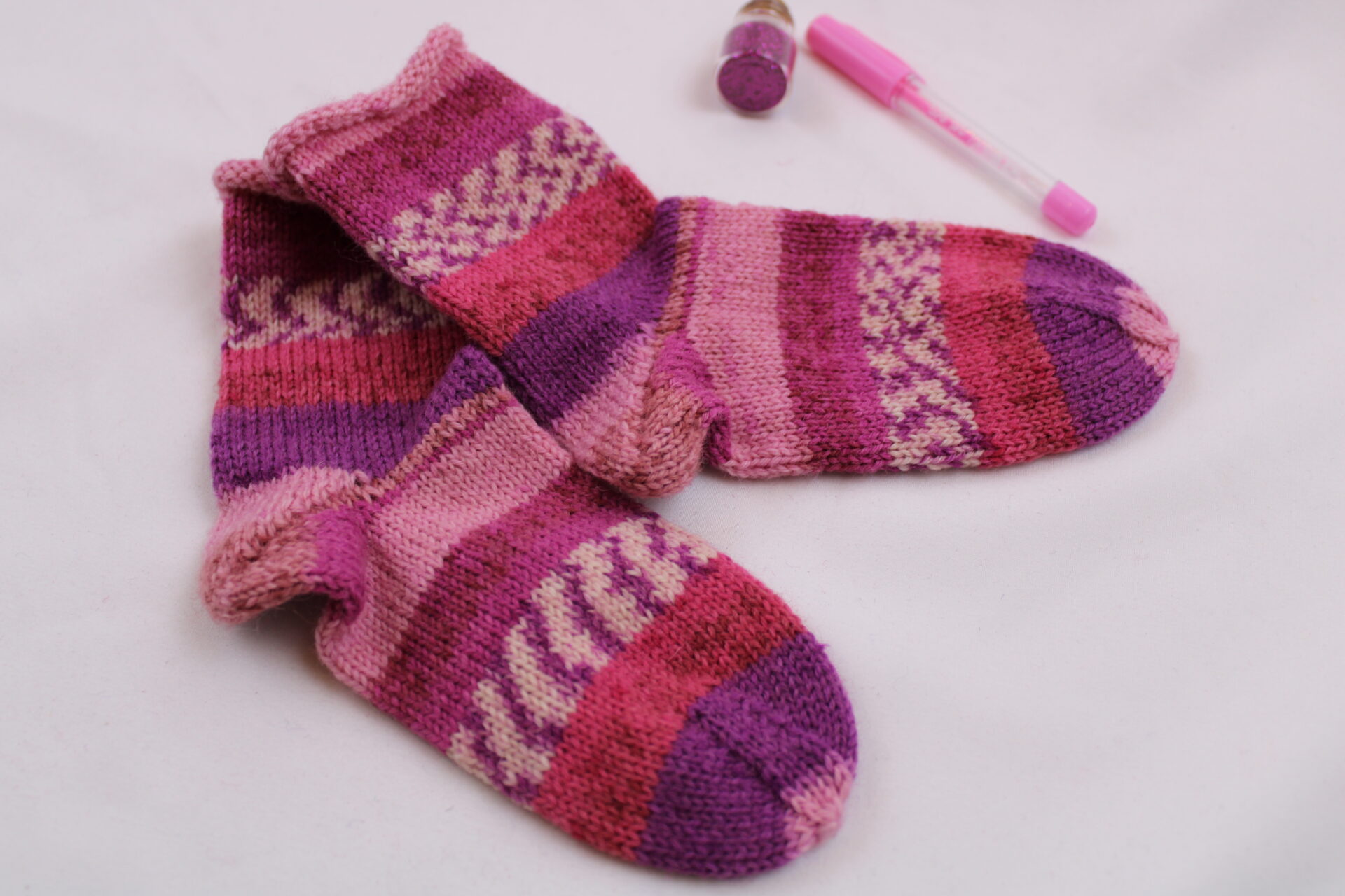 Gr. 24/25 – Kinder-Wollsocken handgestrickt, rosa-lila mit Rollbündchen