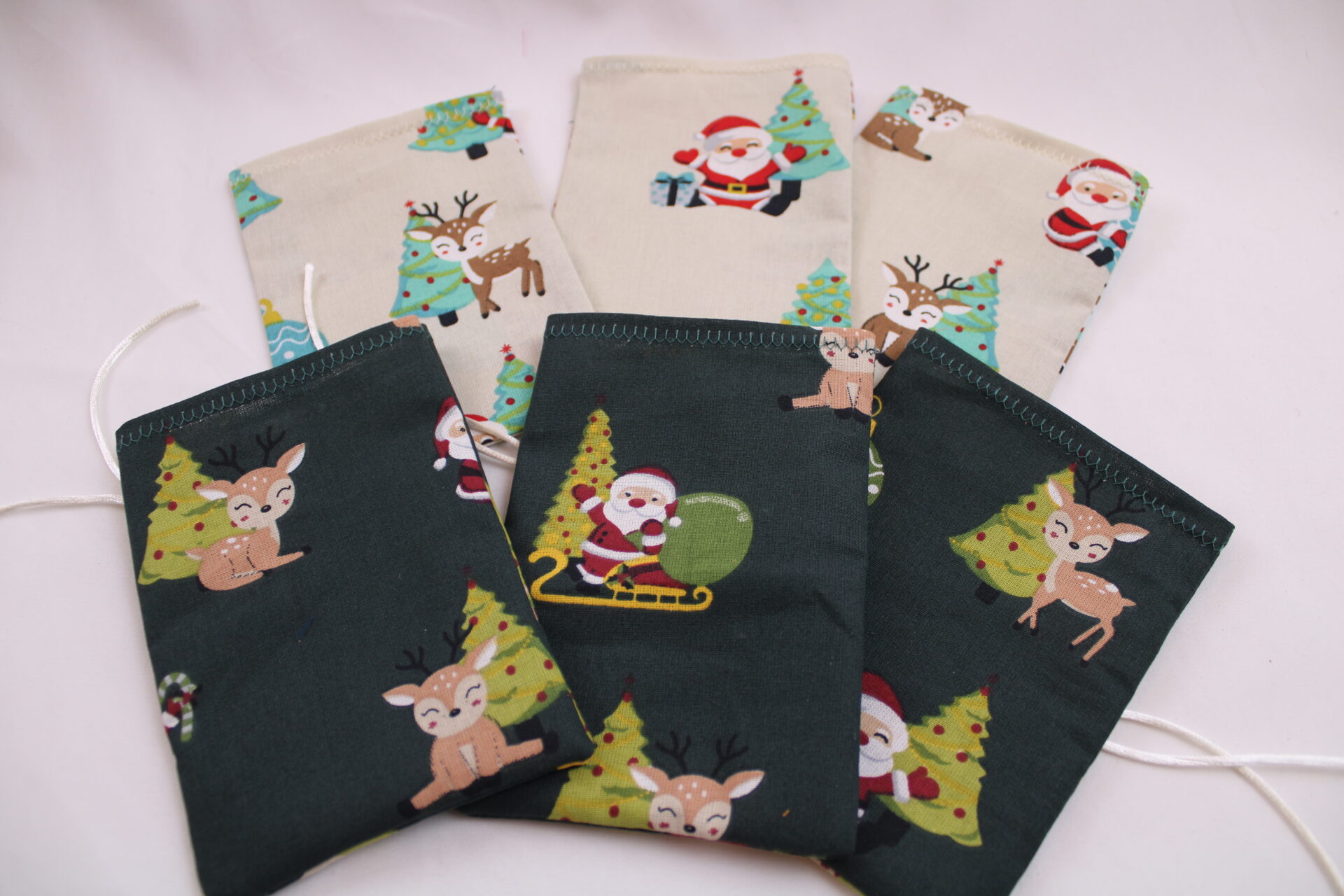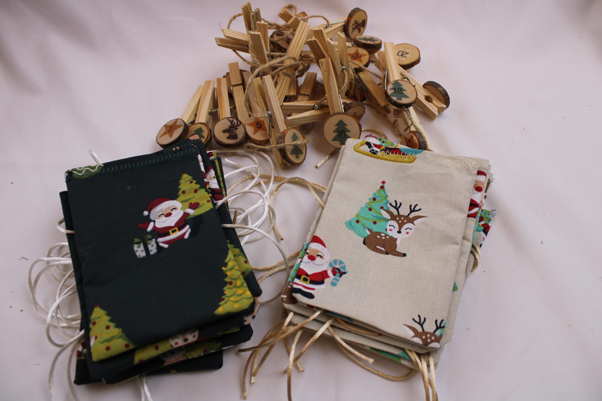 Adventskalender-Säckchen „Santa u. Rentier“, handgenäht, zweifarbig, mit Holzklammern und -zahlen, z. Selbstbefüllen, wiederverwendbar