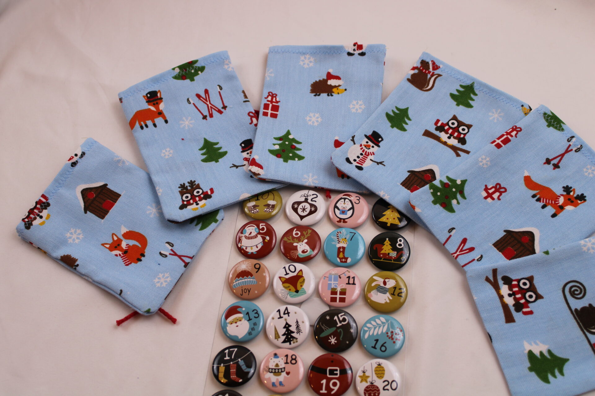 Adventskalender-Säckchen „Waldtiere“, handgenäht, mit Zahlen-Buttons, zum Selbstbefüllen, wiederverwendbar, nachhaltig
