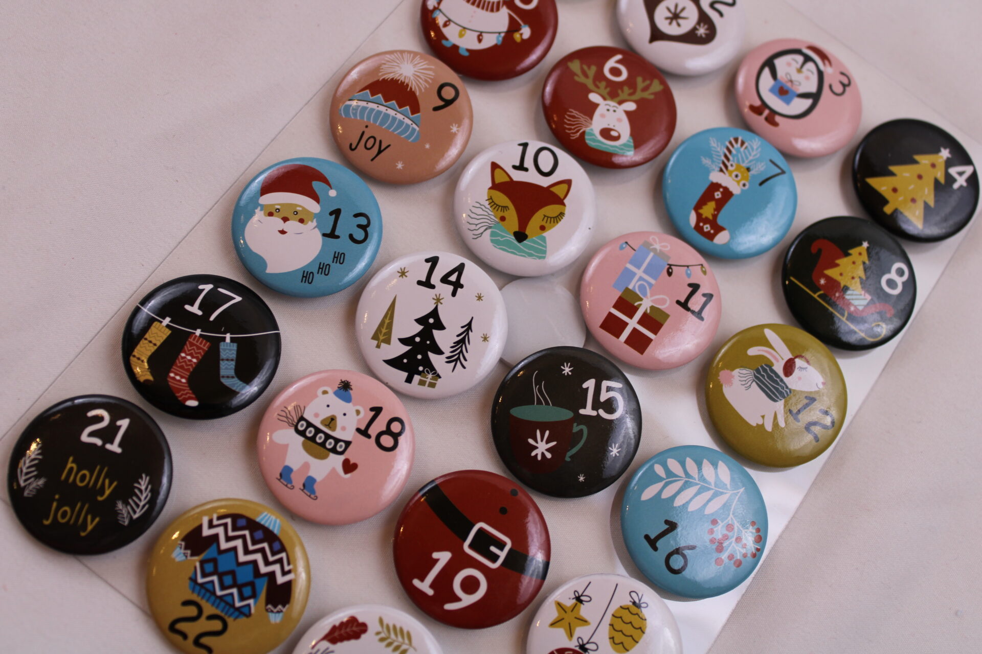 Die 24 kleinen Buttons können an beliebiger Stelle an den Säckchen angebracht werden.