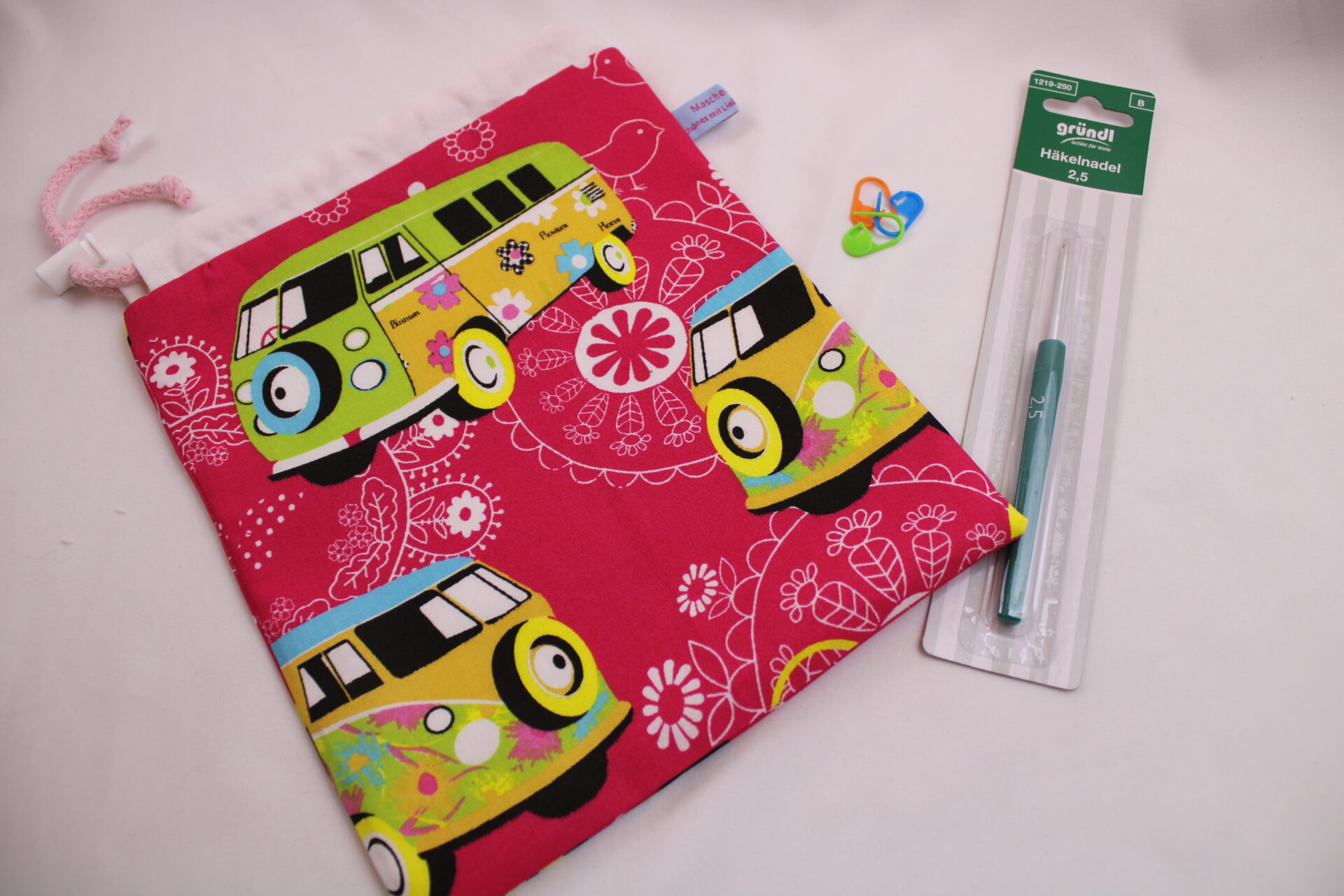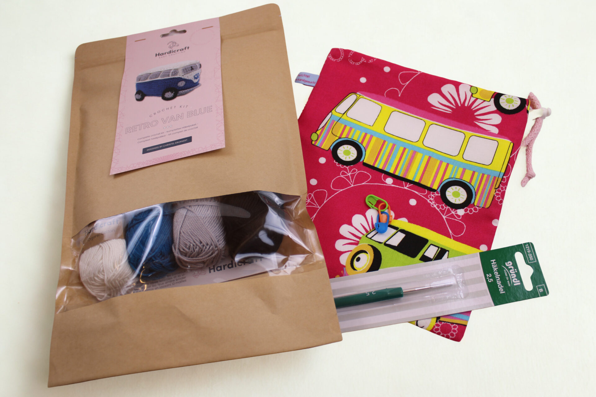 Komplettes Häkelset zum Fertigen eines kleinen Retro-Busses – inklusive Material, Häkelnadel, Maschenmarkierern und Projekttasche Größe S.