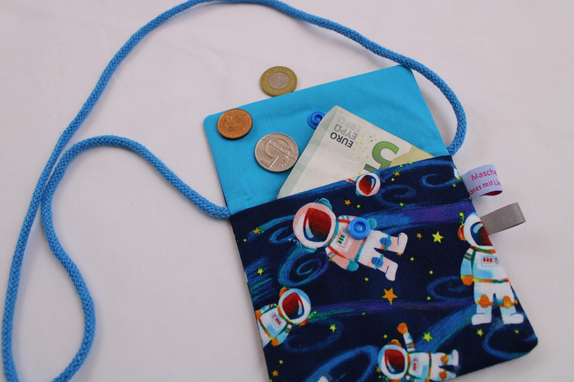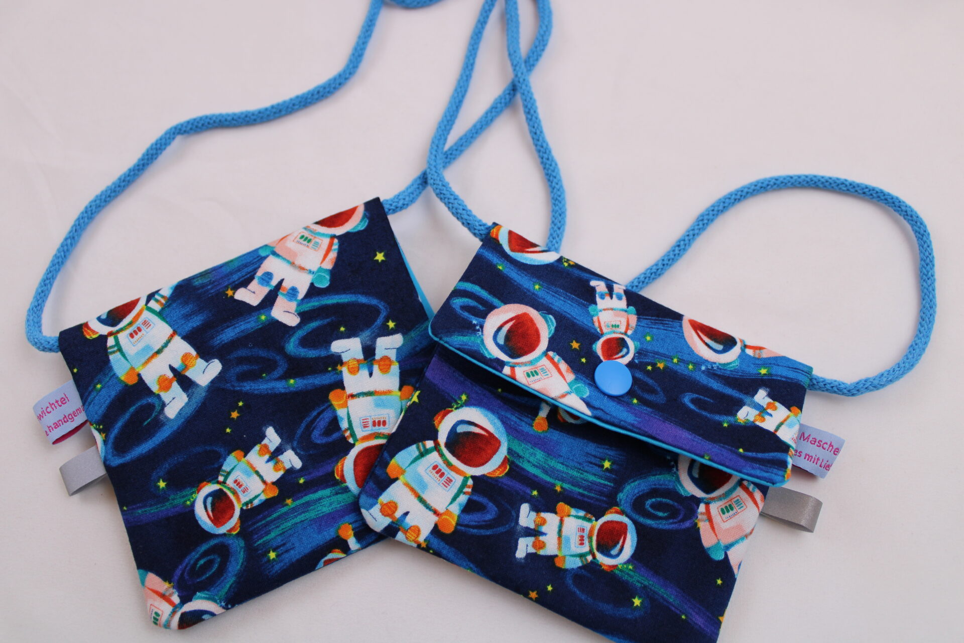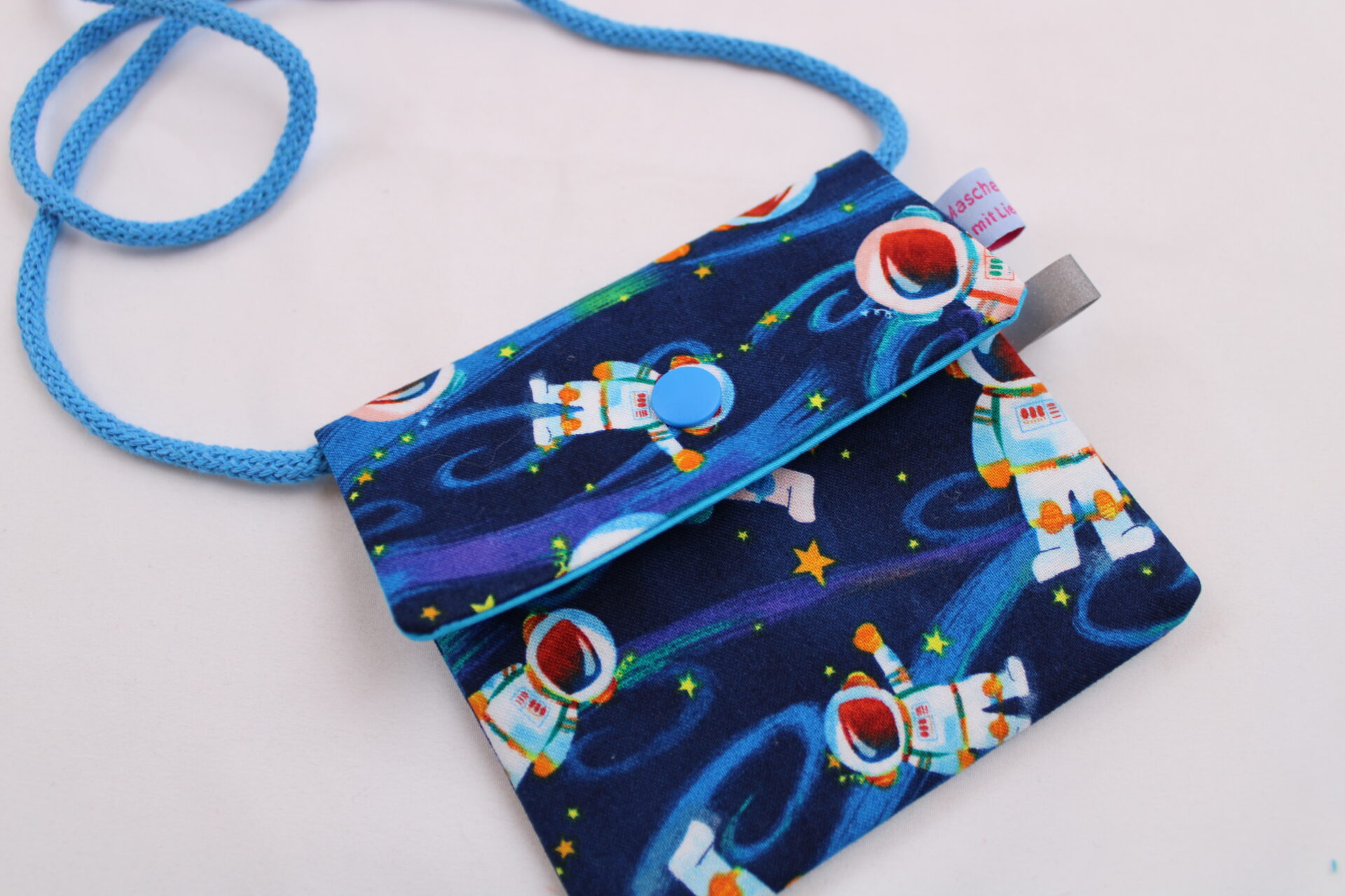 Kinder-BRUSTBEUTEL „Astronaut im All“ mit Druckknopf, Reflektorfähnchen; mit oder ohne Klarsichtfach/Fahrkartenfach, Brusttasche, Geldbörse