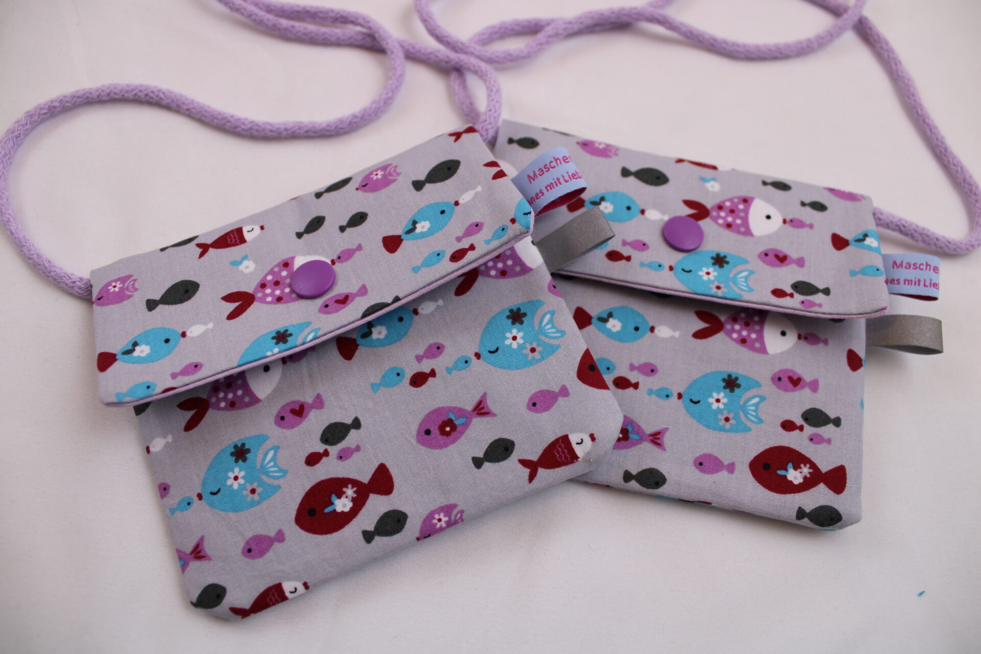 Kinder-BRUSTBEUTEL „Bunte Fische“ mit Druckknopf, Reflektorfähnchen; mit oder ohne Klarsichtfach/Fahrkartenfach, Brusttasche, Geldbörse