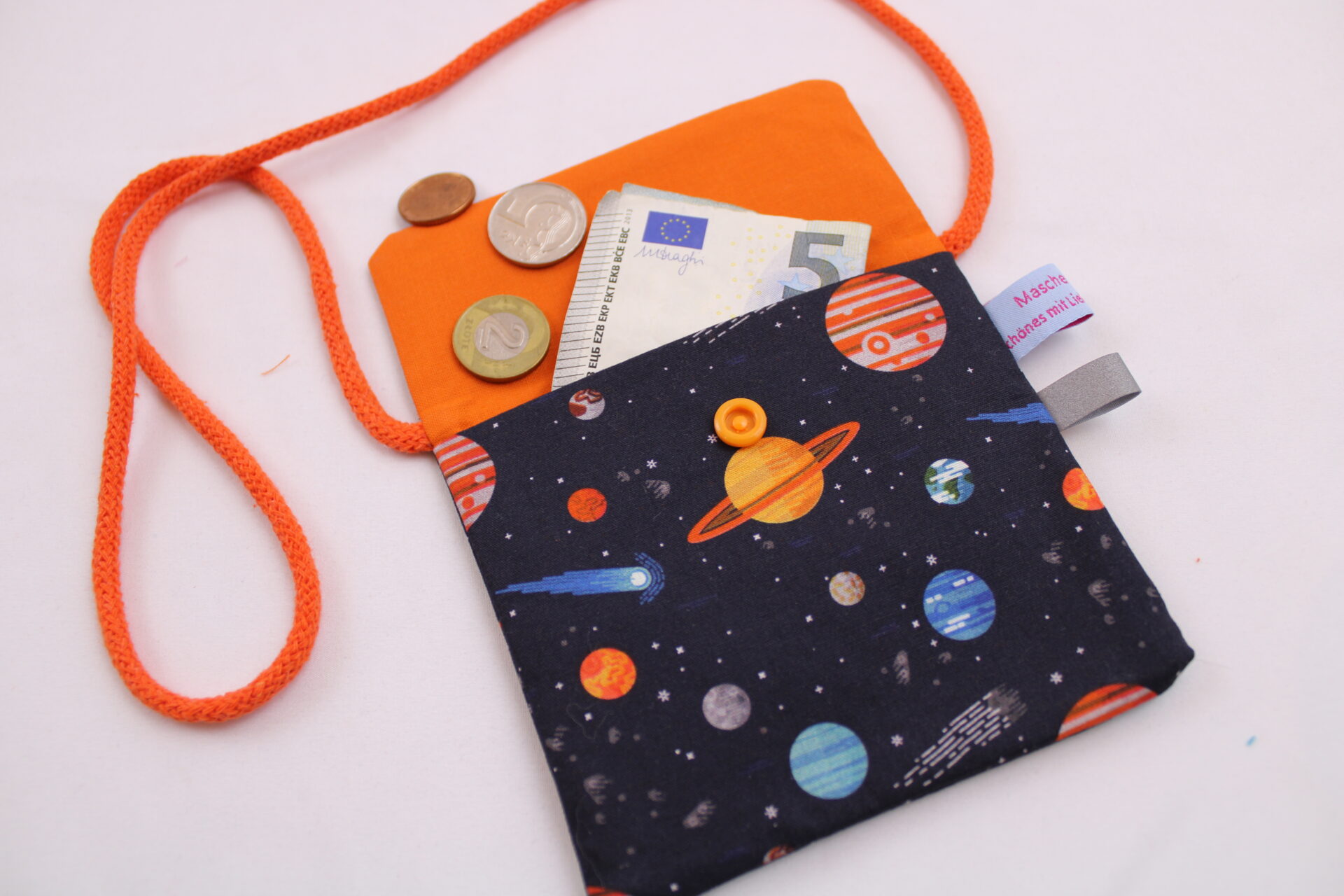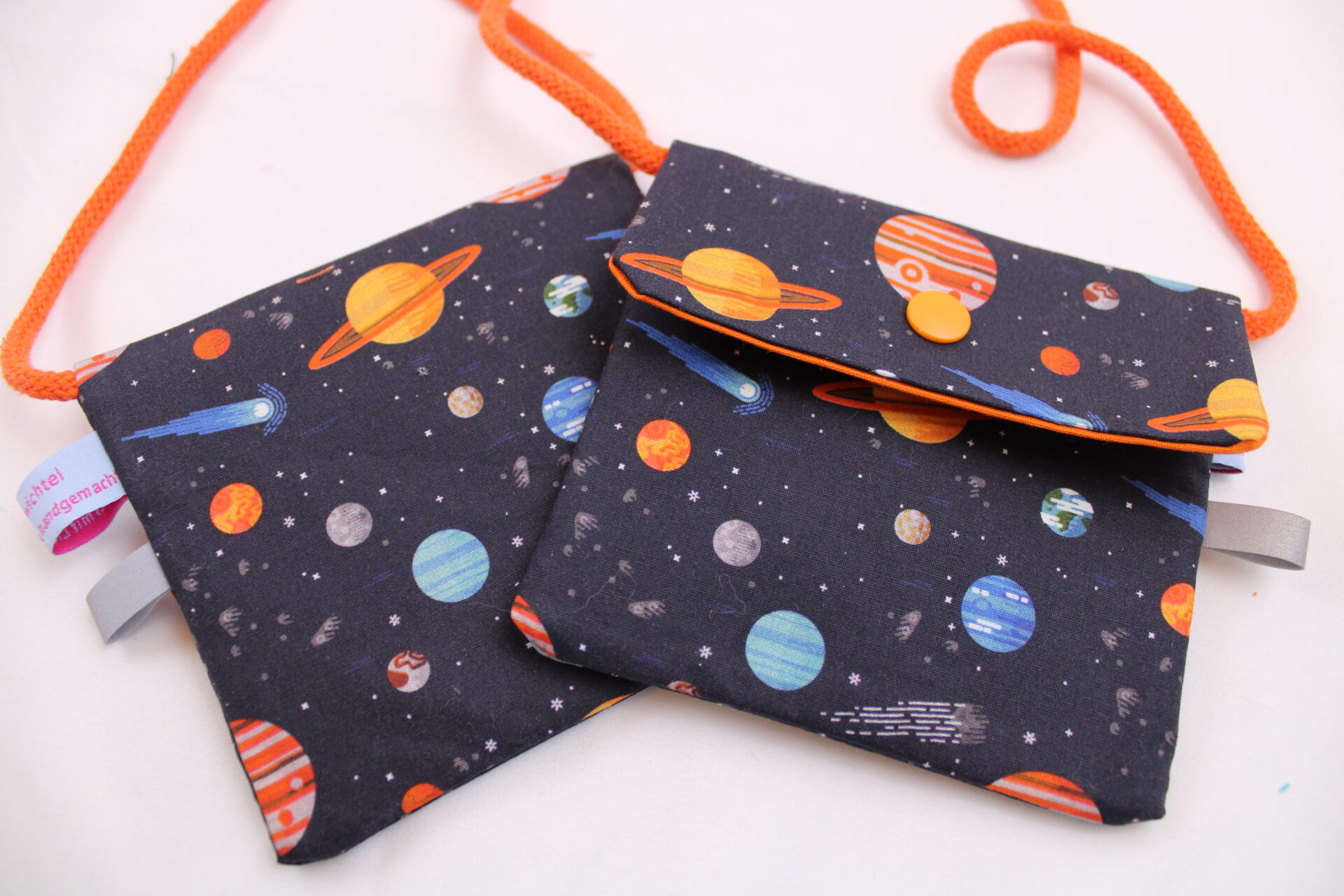 Kinder-BRUSTBEUTEL „Planeten“ mit Druckknopf, Reflektorfähnchen; mit oder ohne Klarsichtfach/Fahrkartenfach, Brusttasche, Geldbörse