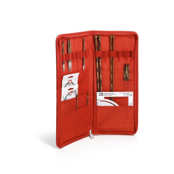 Im rot gehaltenen Inneren befinden sich fünfzehn Gummischlaufen zum Einführen von Stricknadeln in unterschiedlichen Größen und Arten.