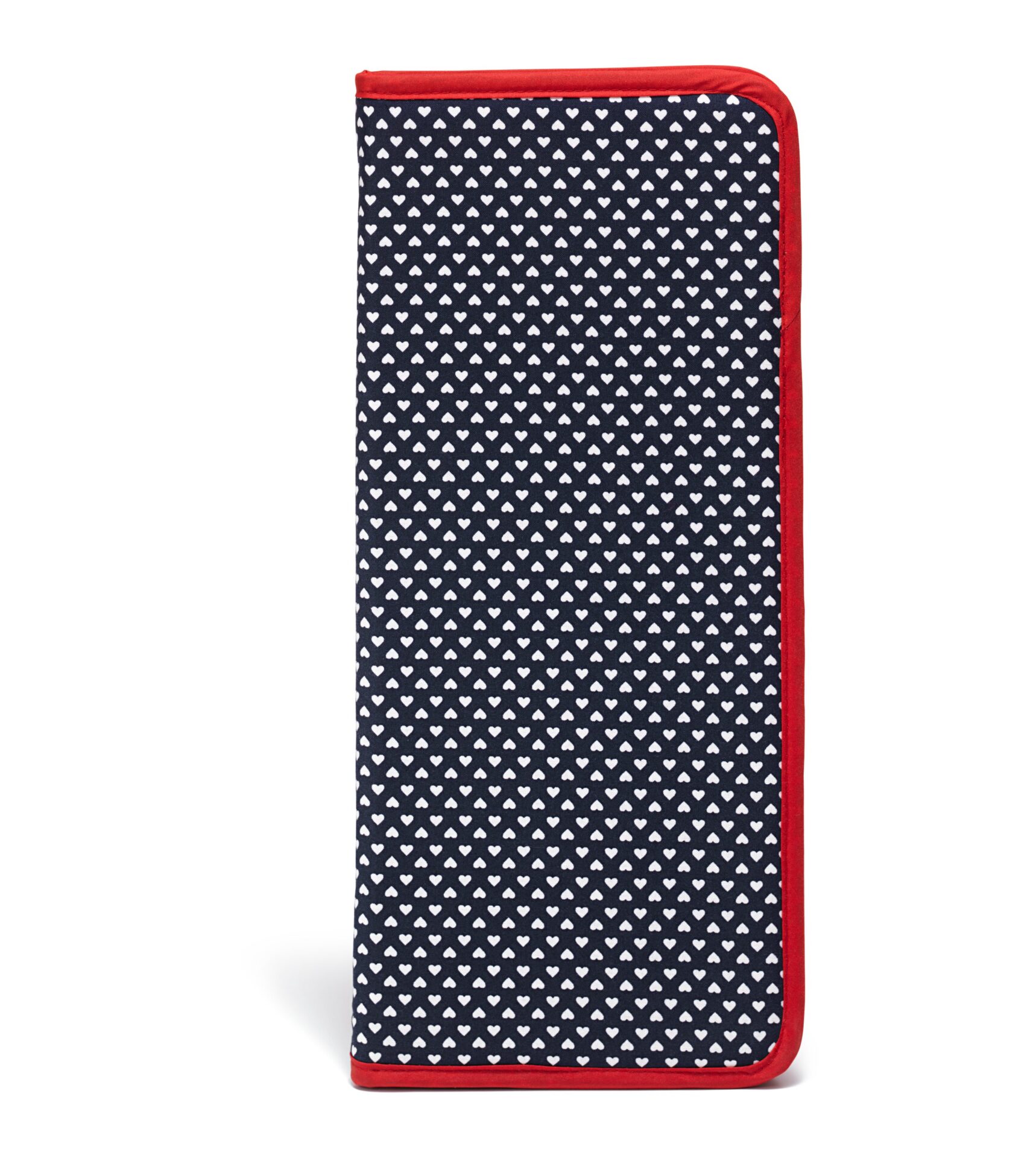 Das Design – einfach schön! So begeistern die kleinen, weißen Herzen auf dunkelblauem Hintergrund, während das Rot bei Kanten und Reißverschluss dieses Stricknadeletui gelungen in Szene setzt.