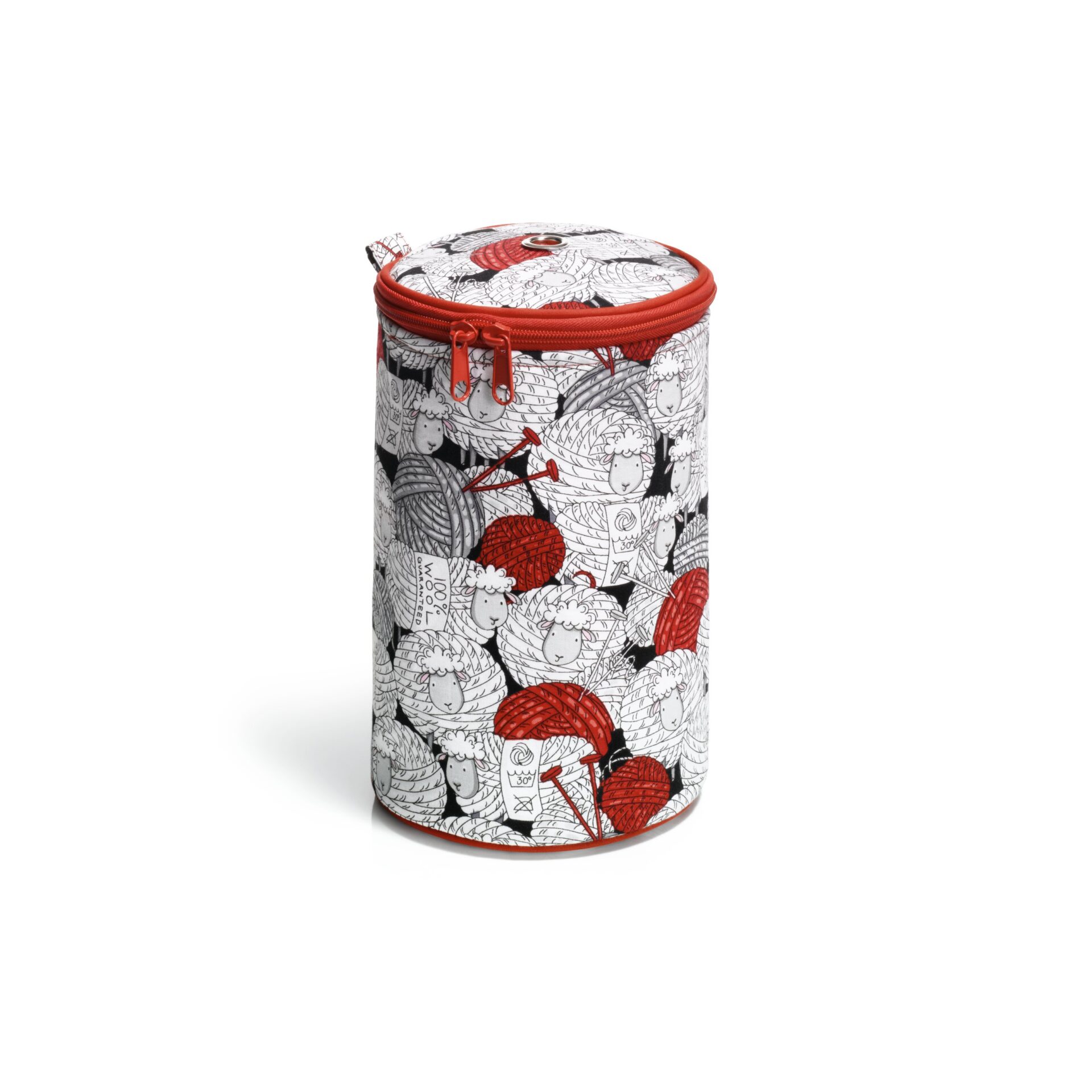 Einfach nach dem Öffnen des Reißverschlusses mit einem Wollknäuel bestücken – aufgrund der runden, glatt-polierten Aussparung im Deckel wird das Wollgarn reibungslos abgewickelt.