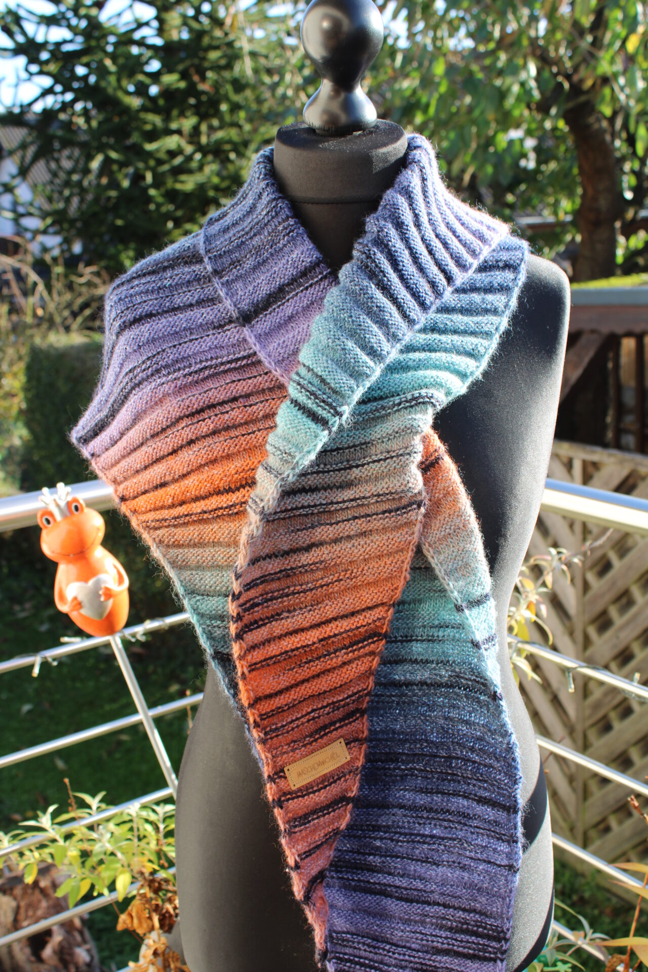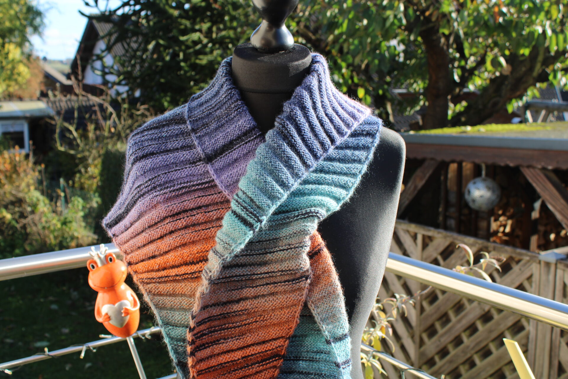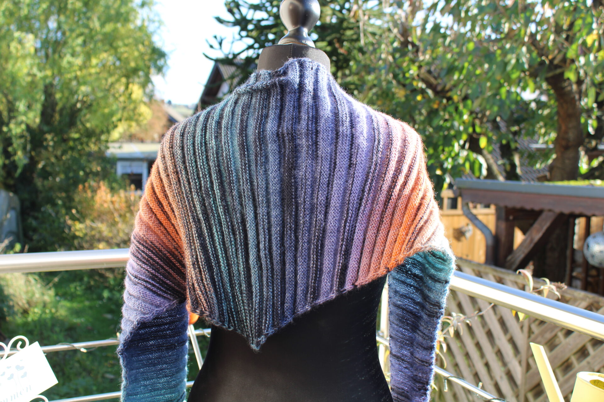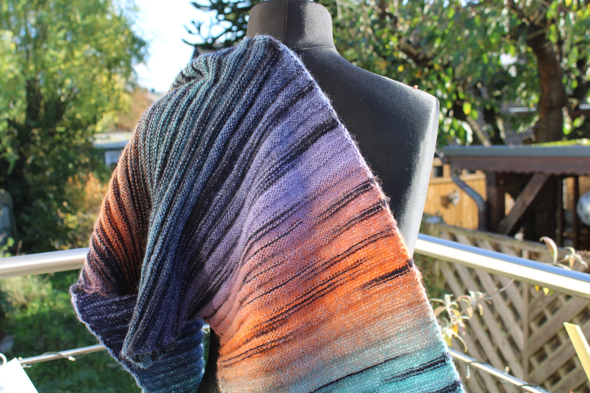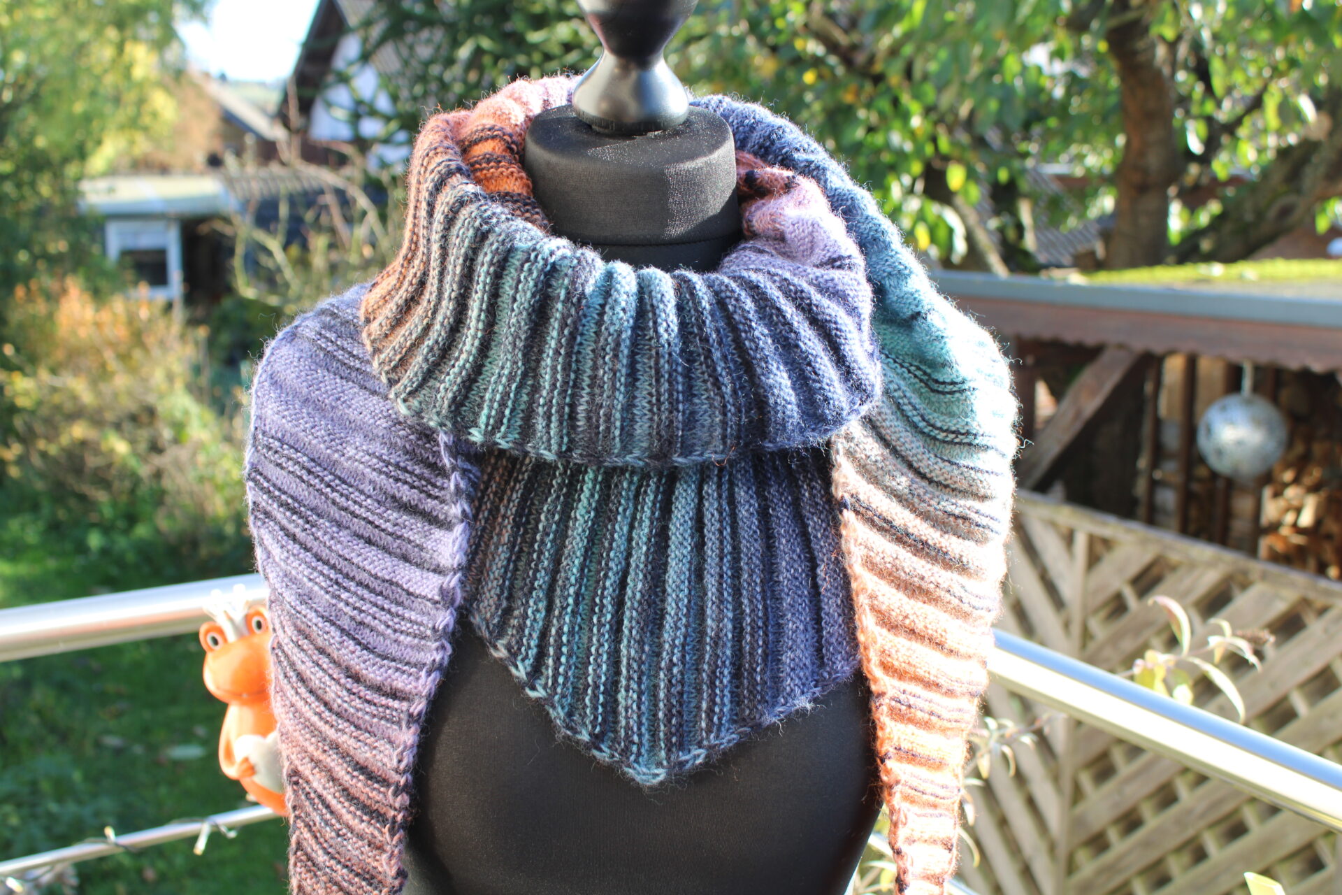 Wärmendes Schultertuch, Dreieckstuch mit Farbverlauf, kürbis-aqua-lila-blau, handgestrickt aus Wolle Gründl FINEZZA
