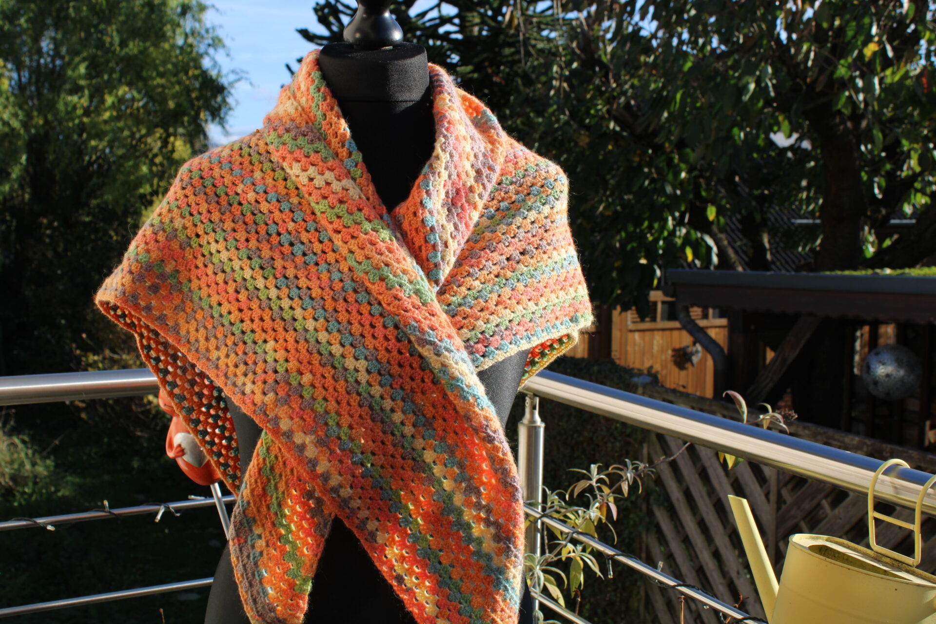 Großes Schultertuch mit Farbverlauf – handgehäkelt aus Gründl MIRABELLA in Grün, Orange, Flamingo & Türkis