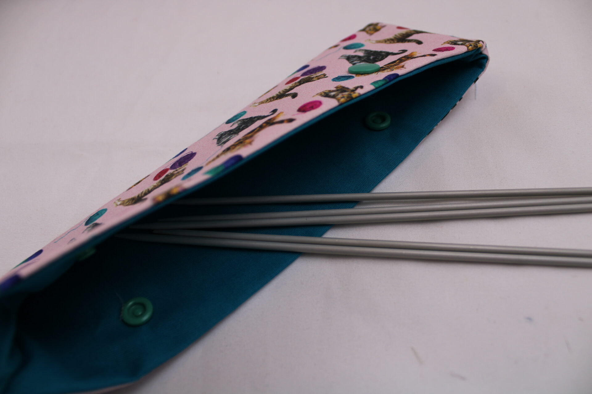 Einfach die Nadeln mit der angefangenen Socke in die Nadelgarage legen, die Druckknöpfe schließen und Dein Werk ist sicher bis zum Ende der Strickpause.