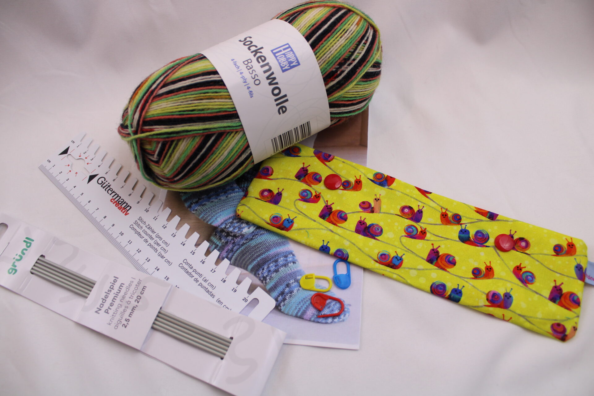 – 1 x Anleitung „Socken stricken“ von Wolle Gründl, mit Größentabelle