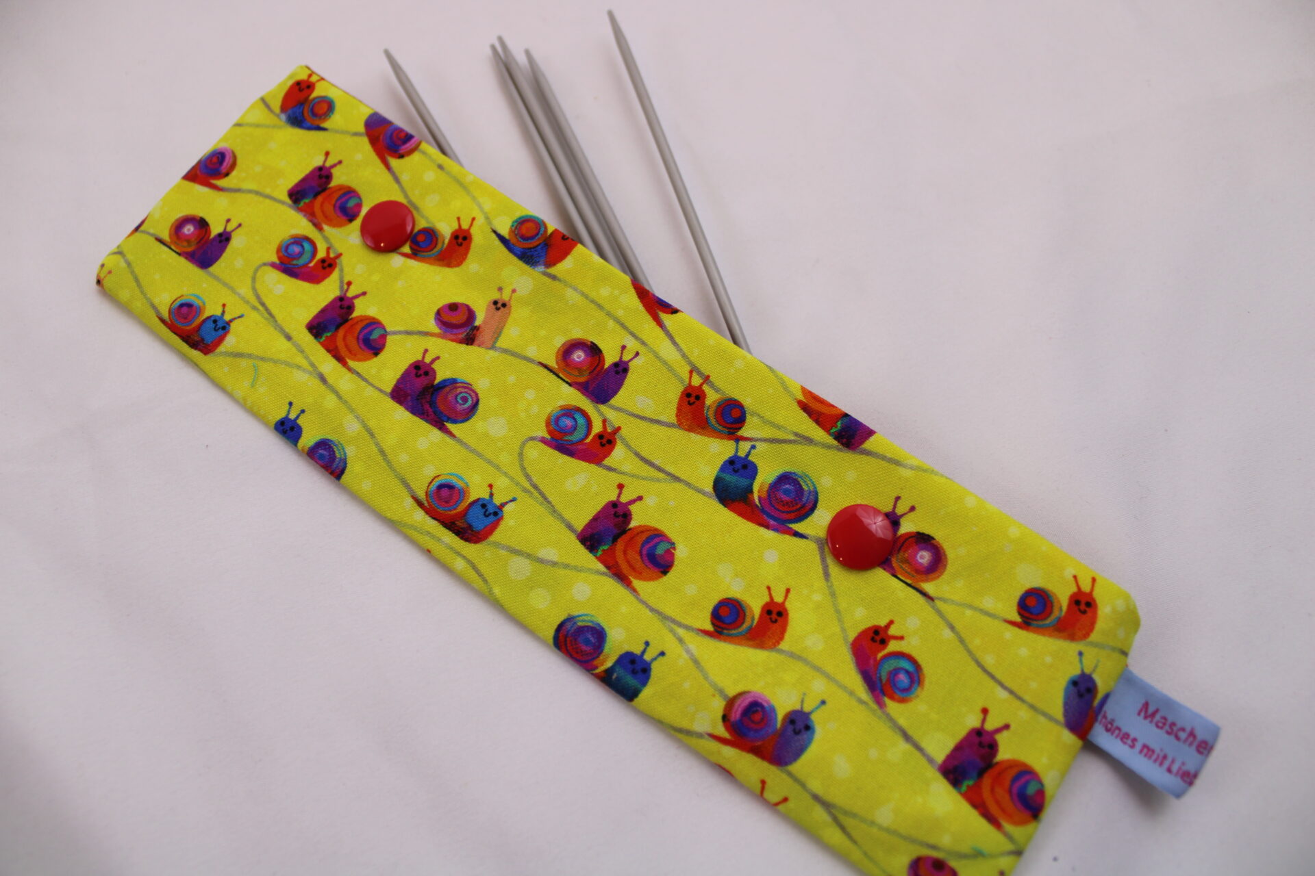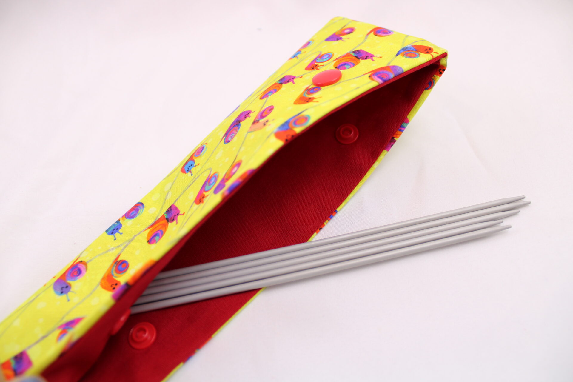 Einfach die Nadeln mit der angefangenen Socke in die Nadelgarage legen, die Druckknöpfe schließen und Dein Werk ist sicher bis zum Ende der Strickpause.
